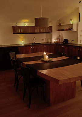 Das Herzstück der Wohnung ist der offene Wohnbereich mit einer großen Fensterfront. Nehmen Sie am massiven großen Esstisch Platz und lassen Sie Ihren Blick über die Gipfel schweifen – ein Panorama, das zu jeder Tageszeit fasziniert.